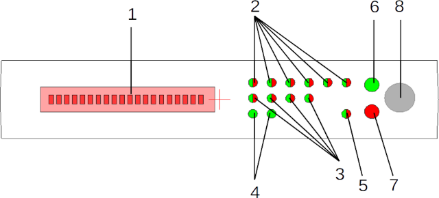 Состоит из трех частей: алфавитно-цифрового LED дисплея (одна строка, 20 символов), дополнительного модуля светодиодной индикации и модуля управления с энкодером и тремя кнопками: Select, Ок и Cancel.