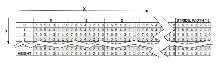Поле stride показывает, сколько байт нужно прибавить к текущему адресу видеопамяти, чтобы перейти на следующую строку. В идеале, оно вычисляется по формуле: ` stride = |_ (width * bpp + 7 ) / 8 _| ` Однако, в некоторых устройствах оно может иметь большее значение. Например, в дисплее с разрешением 122x122x8, разработчик хочет, чтобы адрес видеопамяти зависил от координаты пикселя таким образом: YYXXh, то есть, старшый байт слова являлся Y-координатой, а младший - X. В этом случае, значение stride будет равняться 256, несмотря на то, что при данном разрешении строка занимает только 122 байта. "Хвост" строки от 122-го пикселя на экране не отображается. SETMODE