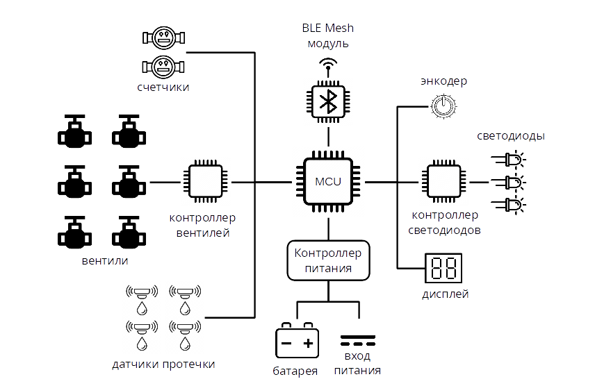 - Существуют запрещенные комбинации открытия вентилей (TODO: расписать эти комбинации), которые нельзя будет настроить с помощью BLE Mesh.